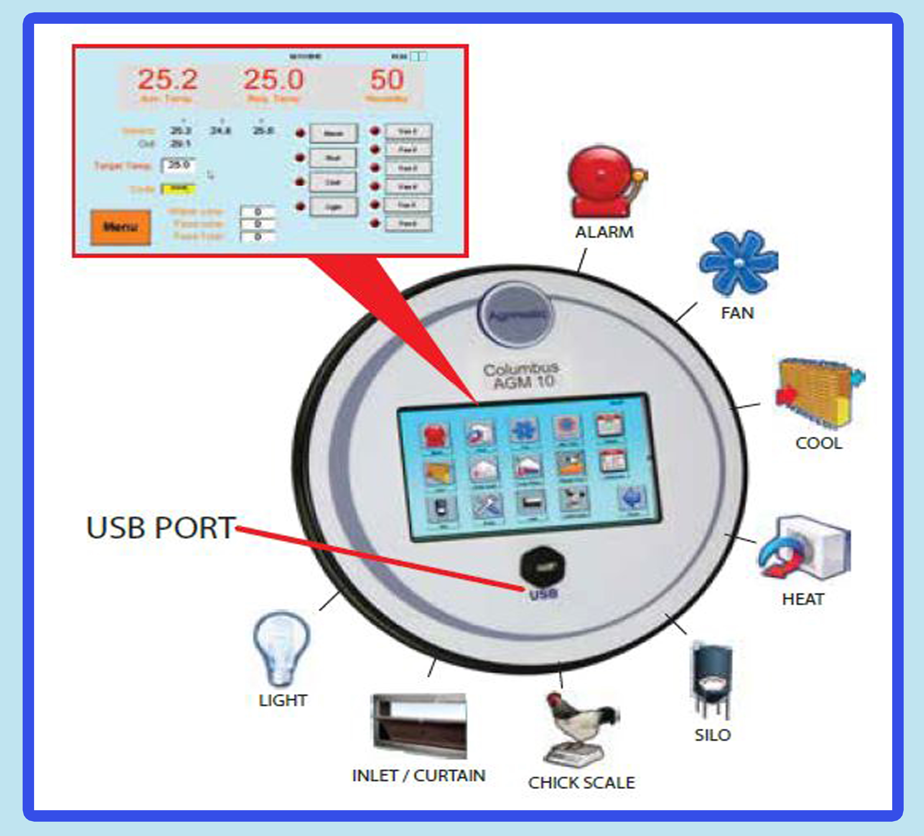 The Columbos AGM 10 Advance Climate Controller has the following functions:
